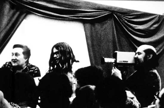 par l'artiste avec Pierre Restany chez Madame Soleil, entourée