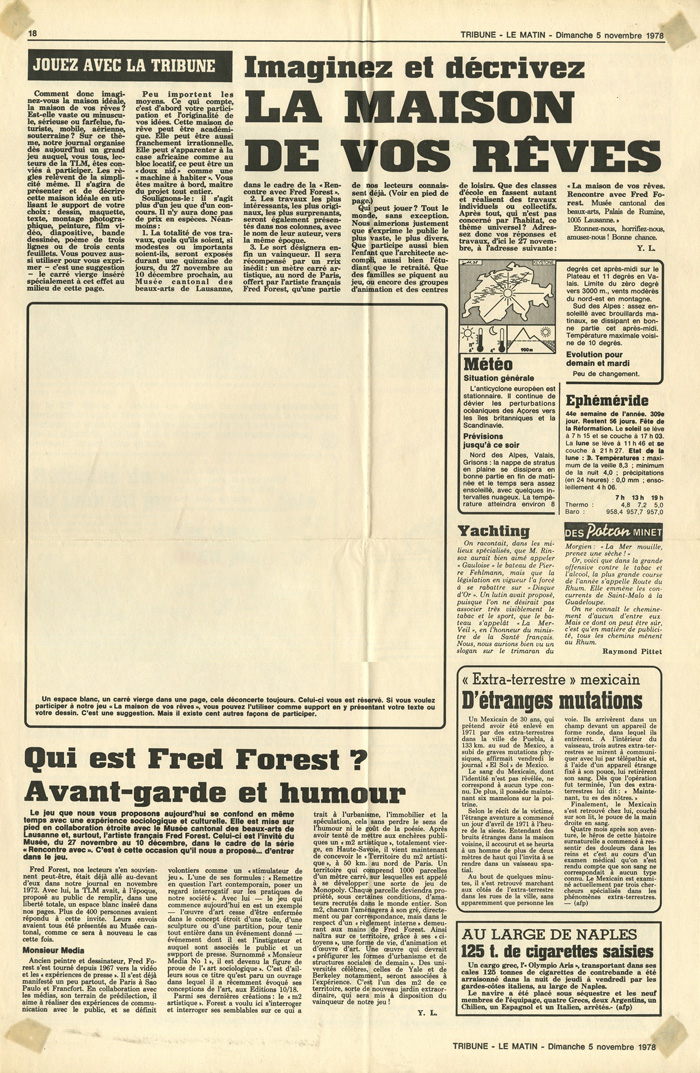 Tribune Lausanne, Lausanne, p.18, 5 novembre 1978. " La maison de vos rêves ".Tribune Lausanne, Lausanne, p.24, 19 novembre 1978. " La maison de vos rêves ".24 Heures Lausanne, Lausanne, 28 novembre 1978. " Vernissage au Musée Cantonal des Beaux-Arts".Tribune Lausanne, Lausanne, p.24, 28 novembre 1978. " La maison de vos rêves : du classique au délire ".Tribune Lausanne, Lausanne, p.2, 29 novembre 1978. " Du plus raisonnable au plus délirant "Tribune Lausanne, Lausanne, p.24, 3 décembre 1978. " La maison de vos rêves sur les murs du musée ".Fémina, Lausanne, n°24, p.68, 6 décembre 1978. " Fred Forest : Le pouvoir de l'imagination "