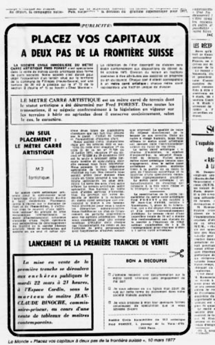 An ingenious parody of the speculative practices common to both the real estate and art markets, this major example of tactical “information art” relies on the subversive effect of “parasitical” pieces of information introduced into the echo chamber of the mass media for the purpose of playing off—and hence exposing—the internal contradictions of centers of power/rackets that rely on the hording and control of information in a particular field. The artist creates an authentic real estate company for the purpose of promoting square meter lots—all part of a remote tract of land in the countryside near the Franco-Swiss border—that are officially designated as “artistic” square meters in papers filed at the local title office. He then places “for sale” ads in several prominent national and international publications and announces that the first of the “artistic” square meters is to be auctioned off at Le Crillon. The artist is interrogated at police headquarters at the request of the Interior Ministry, which later intervenes to block the public sale on the grounds of false advertising and suspected real estate fraud. The artistic square meter of land is replaced at the last minute with a “non-artistic” square meter of fabric. The auction proceeds and the mundane cloth fetches a high price, no doubt driven up by the publicity the whole affair has generated—a denouement that prompts the art critic Pierre Restany to formally declare that the non-artistic square meter was indeed a true work of art!