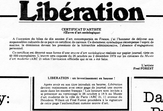 Appearing on the last page of this daily newspaper, a framed “artist’s certificate” declares the day’s edition a work of art, castigates the art establishment for its bureaucratic spirit and lack of imagination, and states the artist’s subversive intent to make a copy of the work his invited submission to a exhibition entitled “Ten Years of Contemporary Art in France.”