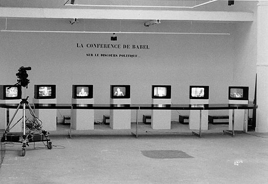 With the help of an independent FM radio station, the artist hijacks one of the nation’s most listened to political talk shows—Europe 1’s weekly “Club de la presse”—via a simultaneous radio broadcast on which journalists from the alternative political news magazine TEL and special guests (e.g., politician Bernard Stasi, writer Philippe Sollers, and advertising mogul Jacques Séguéla) listen to and caustically dissect the Europe 1 program. The set of the artist’s parasitical broadcast shares gallery space a satirical installation, also created by the artist, featuring a conference table surrounded by 10 television monitors all simultaneously playing videotaped speeches by different heads of state.