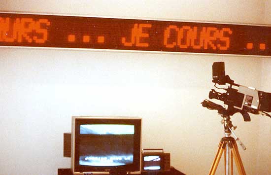 A video monitor playing non-stop a tape featuring a solitary jogger is surround by six simultaneously operating LED message boards recreating the different layers of thought of the protagonist, which stream by at different speeds: reminiscences, desires, anxieties, philosophical musings, lists of things to do, insignificant reverie, recurring instances of immersion in the act of running, etc.
