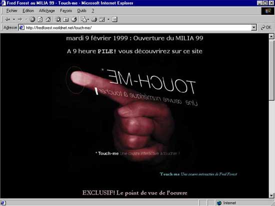 This work explored another dimension of time in a technological environment, entropy, while also call attention to the issues of copyright protection and preservation as they apply to digital works. It featured a virtual creature that was said to be sensitive to the human touch. The “cells” of its body were made up pixels recycled from works of art in the sponsoring organization’s database. A contemporary version of the “vanities” painted by 18th century artists, it had a preprogrammed life span, began to disintegrate from the moment of its “birth,” and eventually “died” (i.e., it disappeared altogether). However, by touching the screen of the “Touch-Me” exhibit clicking a button on the web site, visitors could trigger a sensor that temporarily arrested the progress of disintegration and even restored lost cells—a truly lifesaving caress.