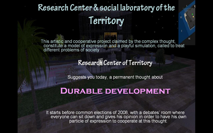 Politic personalities are invited to express and debate their points of view in this space about this theme, as it appears in their electoral program (the interventions calendar will be the object of a later press release. Journalists must ask to get accustomed to make their Avatar present in real time). Out of politic personality’s interventions, the visit of Experimental Center of territory and social laboratory is free (see Access practical modalities below)