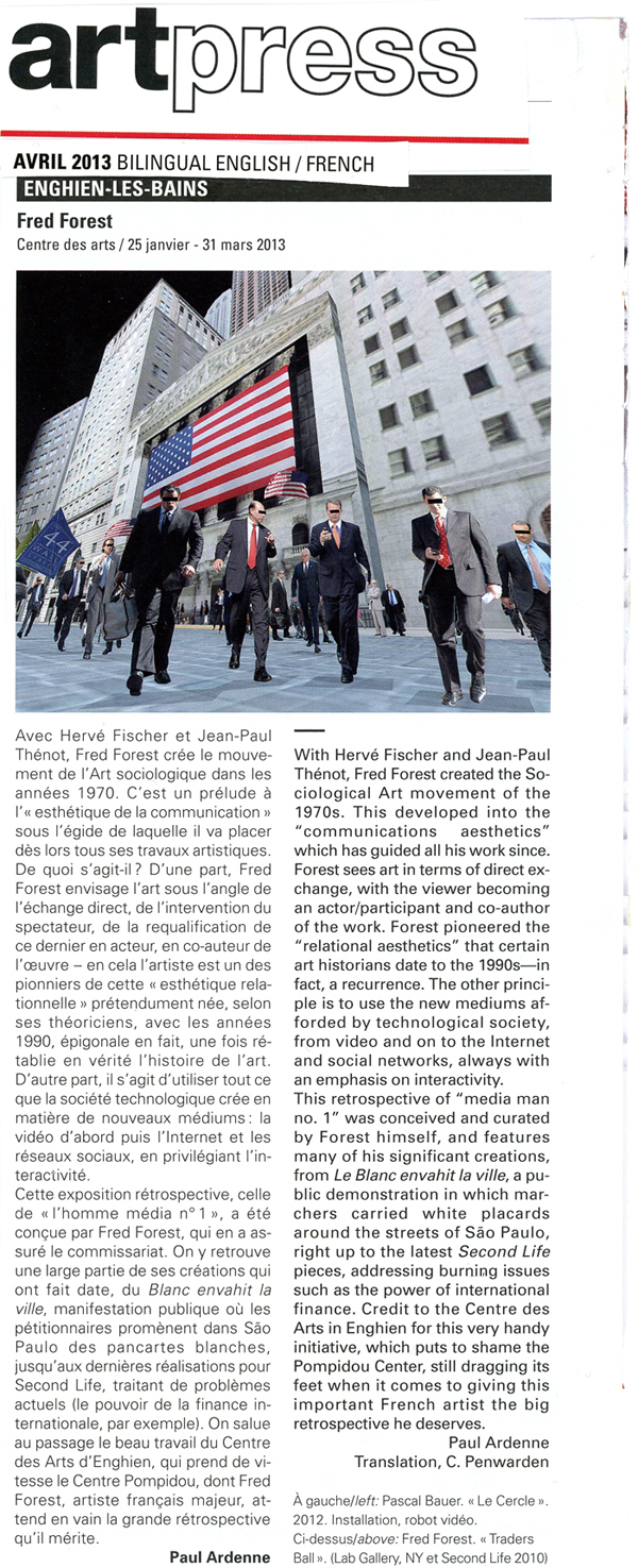« Fred Forest : l’homme média n°1», est donc un parcours alliant des oeuvres récentes à des dispositifs plus anciens, des propositions participatives, capables de rendre évident la cohérence et la permanence de son travail au fil du temps. Les animations urbaines viendront illustrer les nombreuses actions réalisées par l’artiste au Brésil avec « Le blanc envahit la ville » et les « Promenades sociologiques » réalisées à Brooklyn en 1973 et 2011. De même, les expériences sur les inserts de presse dans « Le Monde » en France, « La Tribune » en Suisse 1972, « Sydvenska Dagbladet » 1974 en Suède permettront entre autre de comprendre l’engagement de cet artiste en rupture avec les modèles artistiques institutionnels.