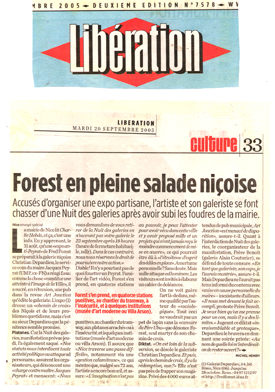 Je lis dans le même journal, six jours plus tard, sous la signature de Jean-Marie Laclavetine, écrivain, sur un sujet tout autre, mais qui pourrait parfaitement dépeindre le milieu de l'art contemporain ses artistes et ses institutions : " Dans une Europe barricadée, la maison France a fermé ses portes et ses fenêtres. La police du langage surveille chacune de nos phrases. Nous vivons dans l'obscurité des vérités communes, des hypocrisies admises, des bienséances cathodiques, des peurs silencieuses, des grandiloquences convenables ". (Nous avons besoin des outrances de Siné; Le Monde daté du vendredi 1er août 2008 p.14))